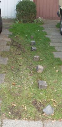 Hier zeige ich sehr anschaulich, wie mein fürsorglicher Nachbar mich vor dem grausigen Schicksal bewahren möchte, versehentlich über sein Grundstück zu fahren, wenn ich in meine Einfahrt oder aus ihr heraus fahre.